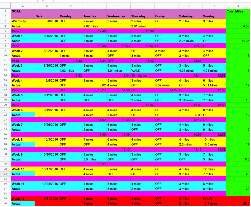 You are more likely to follow through on a goal if you have a solid plan on how to actually get there. When you get in your car to go somewhere new, you use your phone or GPS to guide you to your destination. You have to create a guide to get to the finish line. I started jogging and walking to build up my stamina. When the half marathon date was getting within sight, I created a 12 week mileage plan to get me to the 13.1 mile goal. I tracked my plan and what I actually stuck with. I wasn’t 100% accurate, but the key was to not give up and to keep going.