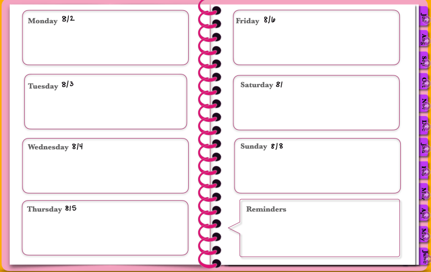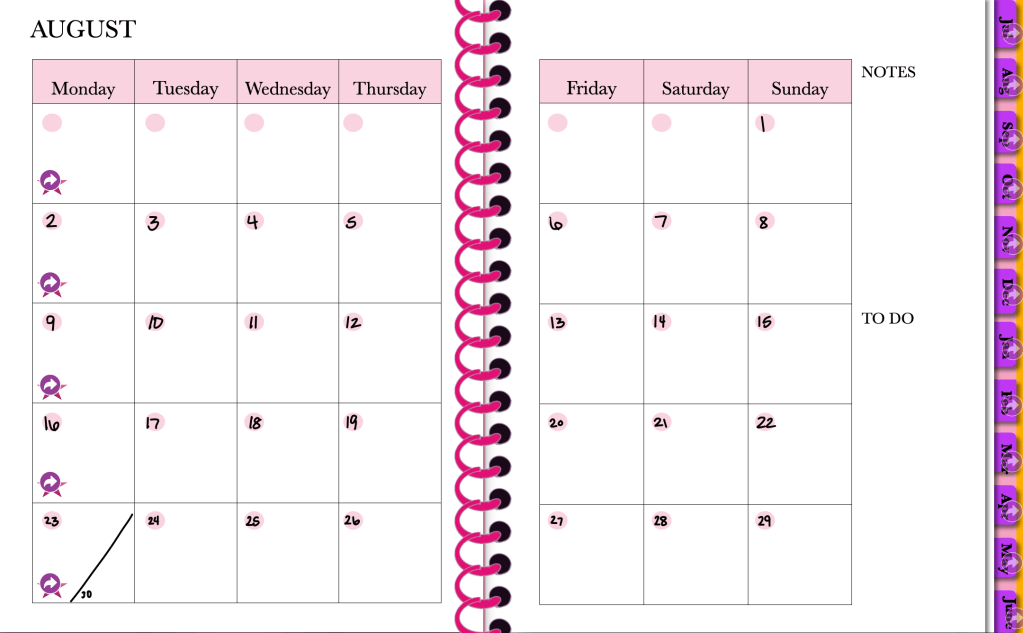 I created a blank cover for my planner and linked monthly calendars with the tabs on the sides. For example, here is my August 2021 monthly view of the calendar.